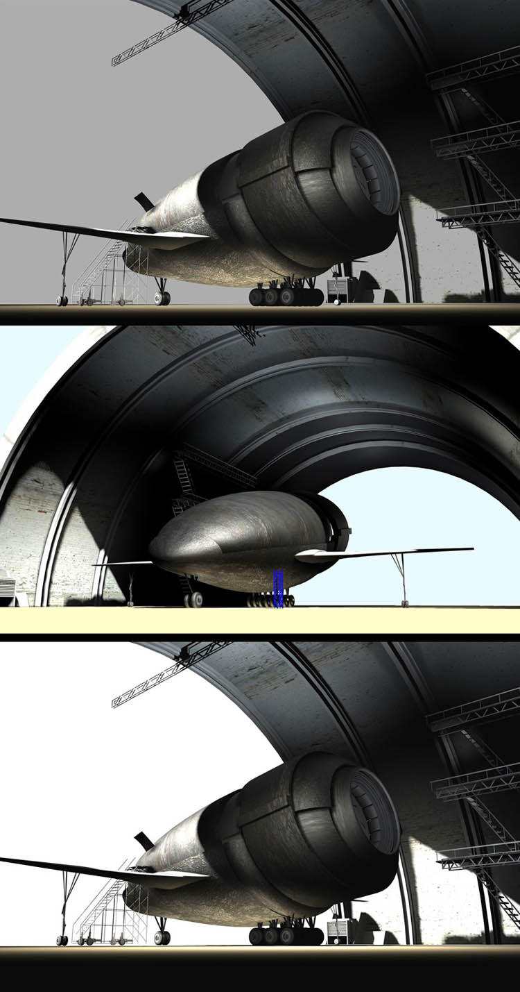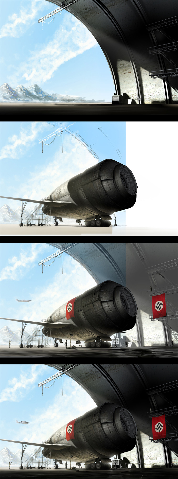 At that work I planned to give the feeling of cold and dry weather. So snowy mountains at the background and glaciation at the overall plan is for that aim. Other than that, clear weather and sun is important for the dry-cold weather effect. With volume light i increased the darkness part effect of hangar. Also with the different transparency in layers i tried to emphasize that effect. At some parts of the vehicle, i used copy layers which are erased locally in order to give the effect of reflections of surrounding light on vehicle and to give some other local effects.