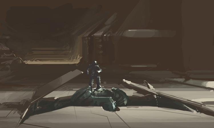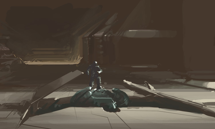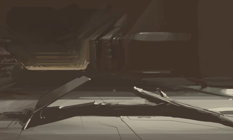 7. The environment evolves now. But there is somthing missing on the empty spaces. Thats right we need an object to fil out the gap. An object adds alot to the composition when its placed right. So lets paint something on the large empty space in the front. Since i was going for a hangar/station/pathway I will paint some doors that opens up from the ground.