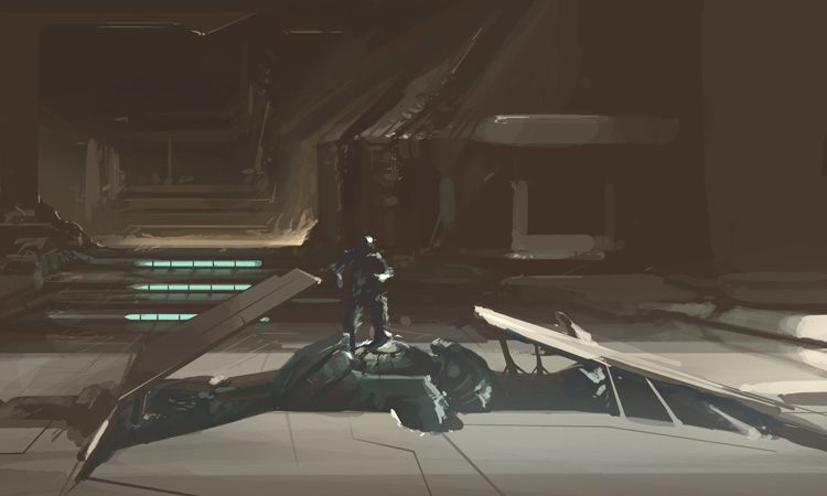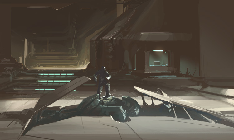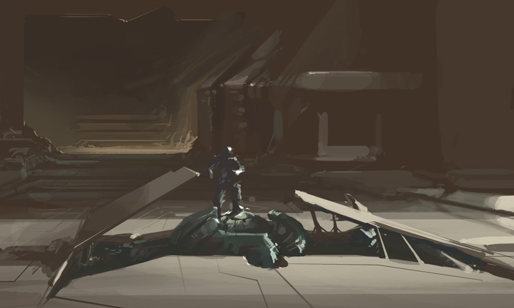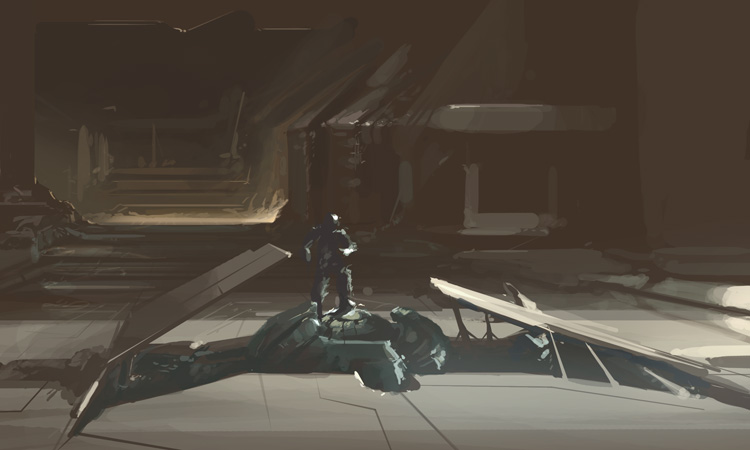 11. In this step i added more to the light, i did it by using a seperate layer on which I painted with a soft edged brush and very low opacity. I did this for the light in the back of the pathway and infront where the doors/ship are.This little ligh effect enhances the lightinteraction.