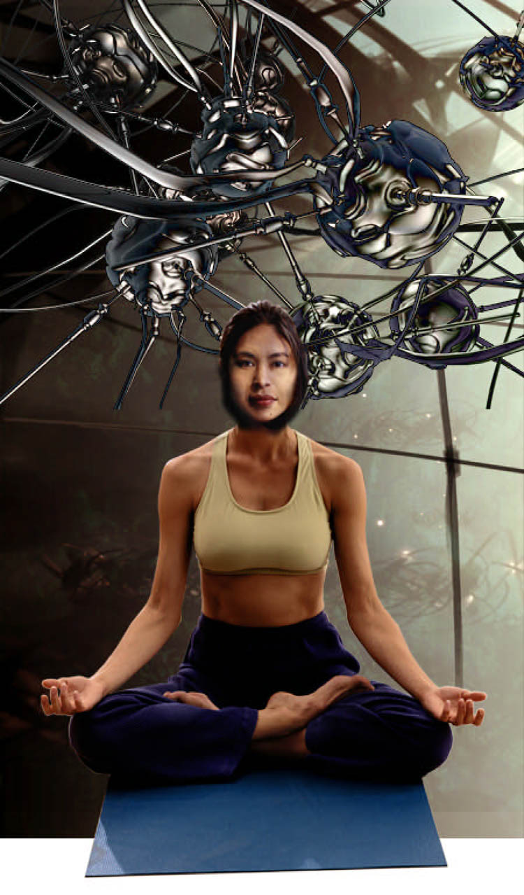 This is a royalty free stock shot in a health and fitness collection. She seemed a good start for a character who had a Zen healing power. I knew that almost none of this picture would survive the final, but it’s good to have a template to make sure anatomy is right. It’s laying in a kind of structure.