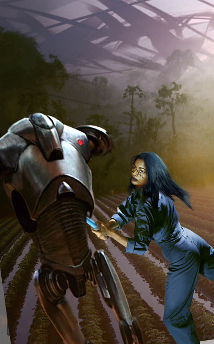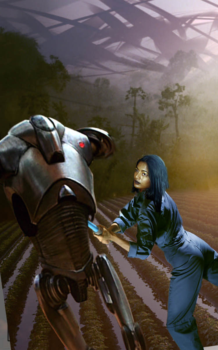 I arched the figure for a more balletic sweep of her motion, added a Barriss head, and relit the figure anticipating the saber sparks. The face is re-lit, and recolored with Barriss’s yellow bronze complexion, and her eyes were refocused on where the “cut” would be on eventually on the droid.