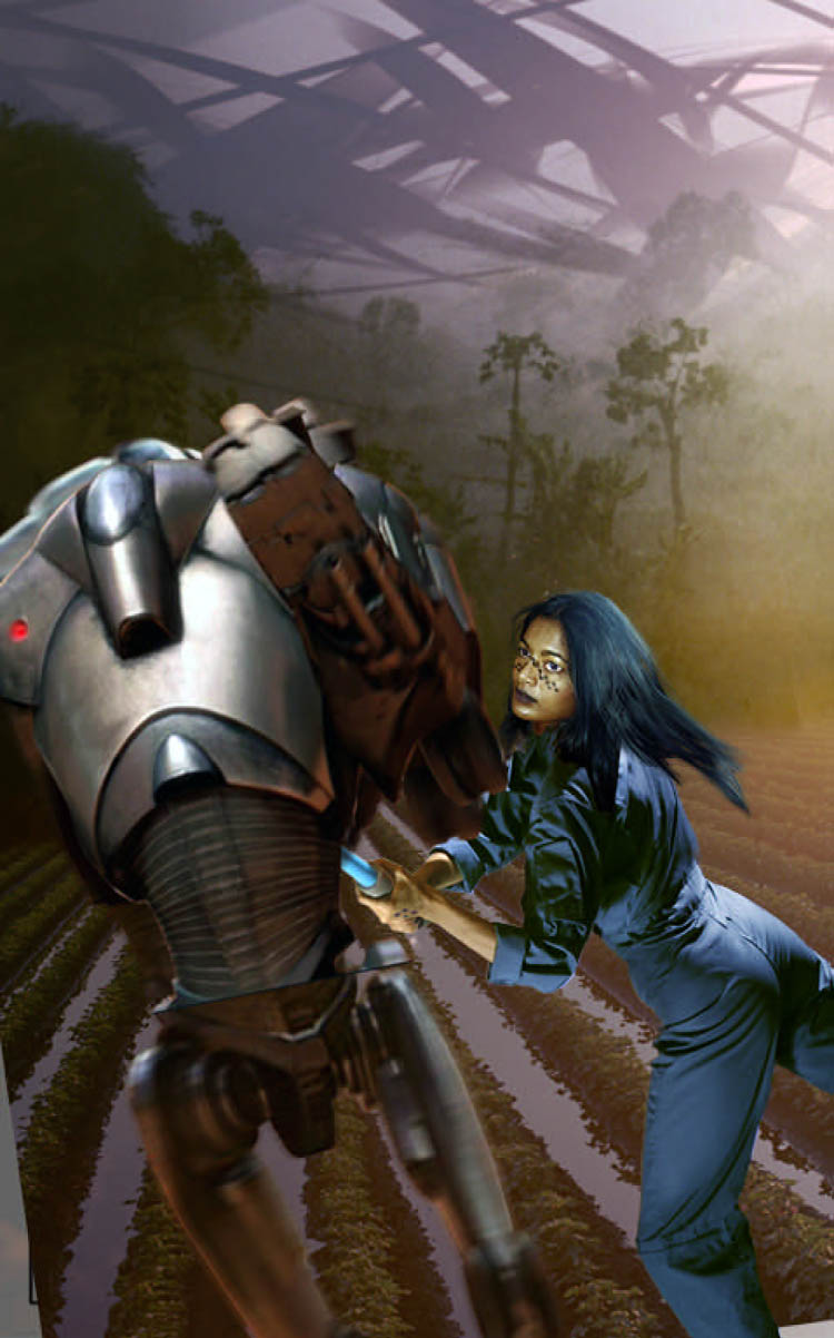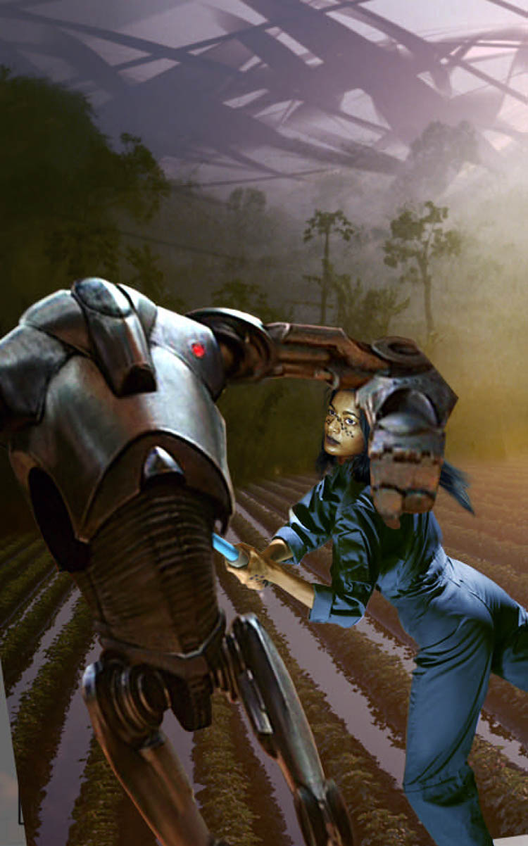 Then I began “fleshing out” the super battle droid. I took a series of screen grabs from Episode II, and cut them up for parts. Because I new I would eventually paint over the image, I could use the low resolution imagery of a movie frame in my collage.