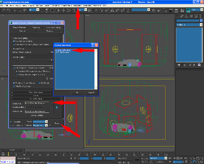 Now you have to go into the Camera View port. Do this by right clicking anywhere in your perspective view port and using the keyboard shortcut key C for Camera. Next, on the top tool bar find Rendering, when the pop-up menu comes up, select Render. From there, the Render Scene dialog box will appear. Click on the Common Tab if it is not already; scroll all the way to the bottom, and under the Assign Renderer menu click on the three (3) little dots next to Default Scanline Renderer. A dialog box will pop up. Select mental ray Renderer and hit ok. Then all you have to do is hit the big render button at the bottom of the Render Scene Menu or hit SHFT+Q, which is Quick Render.