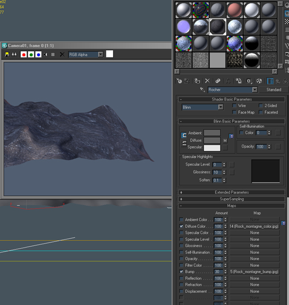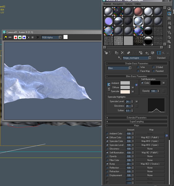Once the modeling is over, I can tackle the shaders and textures. The first issue was about the background mountain: how could I handle in a believable way the snow and the rock?