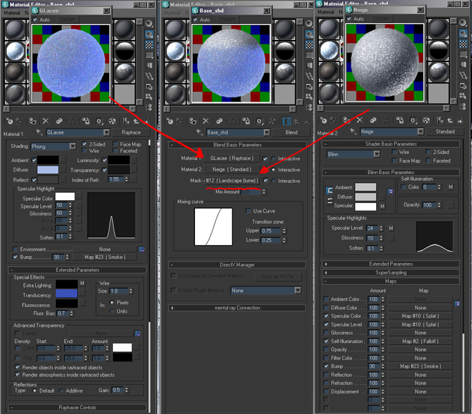 This texture is also used for the ground of the image. For the snow/ice transition below, you can see the ice shader on the left, the snow shader on the right, all laid out in the blend shader with a mask made of landscape material 🙂