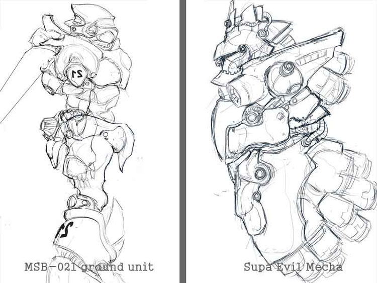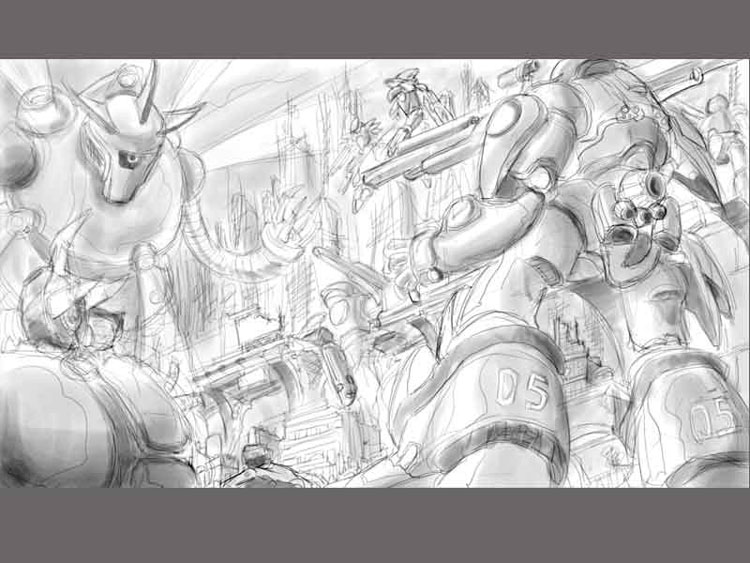 This is the concept of the scene, a very rough line drawing with simple shading.