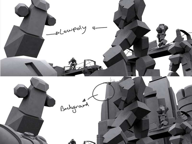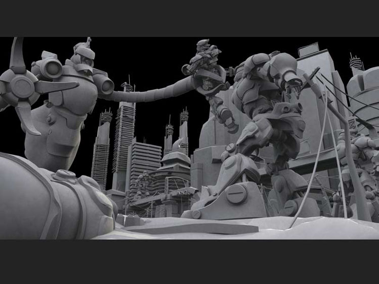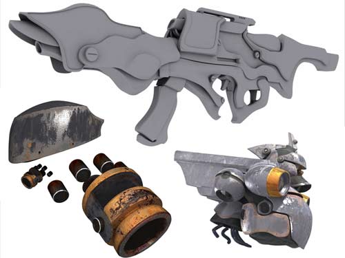 The texturing, unwrapping, & I also build a Rifle for MSB. After all the Models & Textures done, I moved on to the scene proxy. Setting up the camera angle, Lights And testing 1 st block render using a low poly version of the robots.