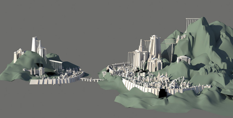 Now the city part. I have a 3D city model (made in Maya) that I made for my ARCVS matte painting. I haven’t used that anywhere else so I decided to give it a go one more time. Of course I edited the overall layout of the city so it looks new now. It’s a combination of Ancient Egyptian and Roman architecture. And yes, I love long pillars, great archways etc. Those kind of features make the painting more epic. You must be very careful about your composition. Always it must make you feel that “you wanna be in that place!” whether if it’s nice or bad. For example it’s like a hell but I wanted to walk in the plains of Mordor while watching Lord of the Rings because it’s very well made.