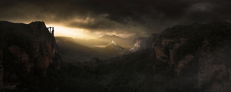 It’s nearly complete. I added some fog, foreground ancient buildings and arches to the top of the hills so they add more detail to the overall scene.