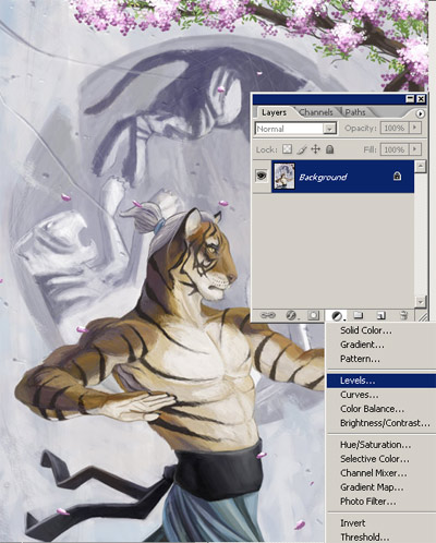 At this point, I decided to create more atmospheres in the image, by introducing cast shadows. To do this, I created an Adjustment Layer: Levels on top of the layer list. I reduced the white output level to about 160, and then I played with the values of each channel to achieve a purple overcast. Adjustment layers have masks automatically attached to them. So I picked my Leafs brush, and painted with black color on the mask, creating light areas. Then I clicked on menu Filters>Blur>Guassian Blur, and I blurred the mask, to simulate cast shadows.