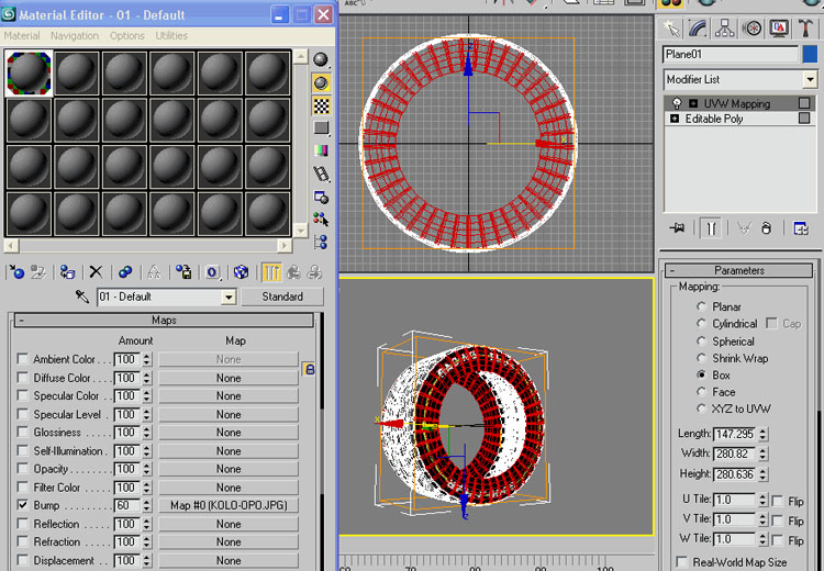 57-set the bump map into your bump map slot with the value of 60 or whatever suits you. then apply it to selected polygons, then apply UVW mapping modifier as below.