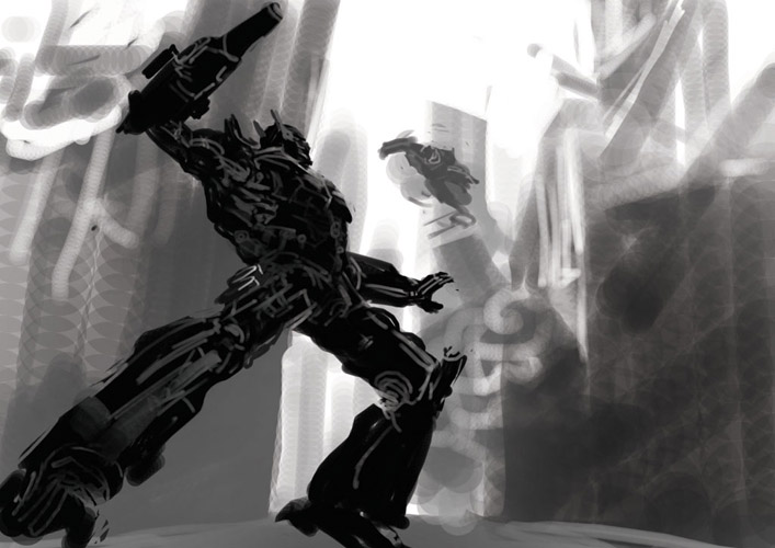 This summer when Transformers hit the big screen, it soon raised up the heat in theaters all over the world. I even went to see the film again particularly for this artwork, in order to get a more vivid feel of the scene, as well as searching for ideas. It is very crucial for a creator to foresee the image in his own mind, and knowing if it would make a good artwork or not. I wanted to create a scene filled with tension and drama, just like a still photographs from the film.