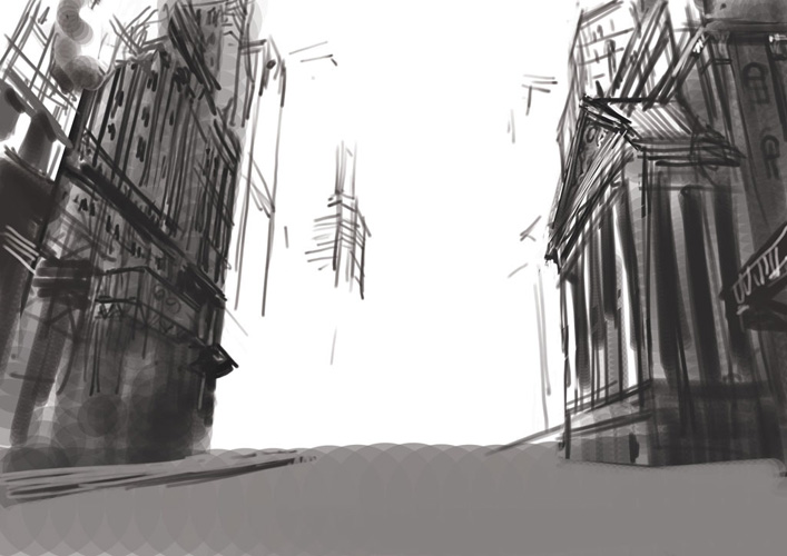 Because the first design of poses were not very good, I decided to redesign the composition and drafted the sketch of the surrounding building. At this moment I begin to think of where is the source of lighting.