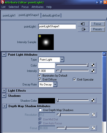 and now open the attributes editor and you could see the settings are pretty much the same as we saw in the Ambient light and Directional Light, but one thing is extra in this light that is the (Decay Rate),