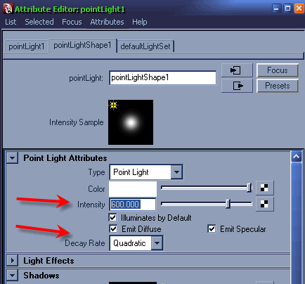 3-now change the Decay rate from no Decay to (Quadratic) and crank the intensity values to something reasonable according to your scene,