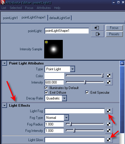 Light Glow = this is pretty neat effect by clicking on the checkered box you are telling Maya to add glow to your light and then you will be able to play with the settings to make it more interesting,