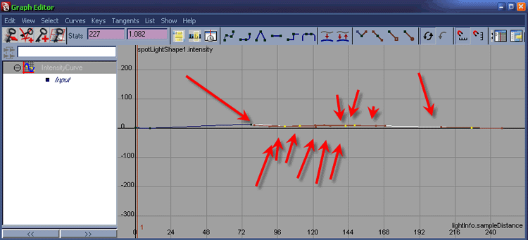 12- once the graph Editor opens, you will see bunch of points, the points in the left side represent the intensity of your light in the scene and the right side ones represent the distance of your light between objects in the scene, select the few points in the right side and then by middle mouse button drag to the left side, and do the same thing with the left ones, and then hit render you will see something very interesting, play with the points you will really love them,