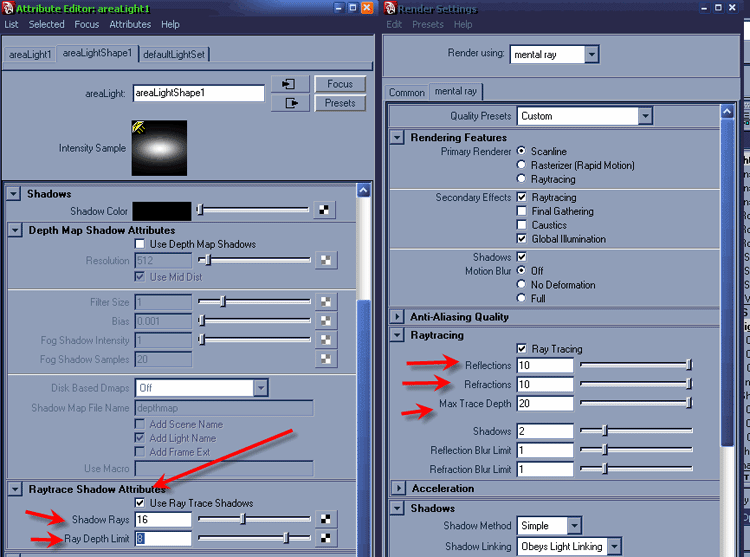 6-select the light and then go to its attributes once again, and now expand the (Mental ray) tab, make sure your rendering engine set to Mental Ray and Global illumination is on in the Render Settings,