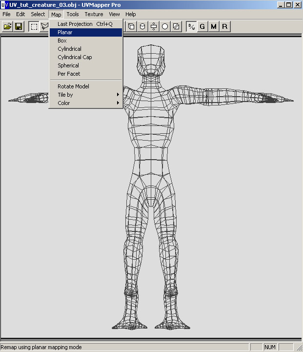 Once you have built your model, export it from ZBrush as an .obj file. Open UV Mapper, and load the model. You may or may not have UV coordinates already assigned to the model, but it doesn?t matter for we will be remapping the whole thing. To get started, assign a planar map to the whole model.