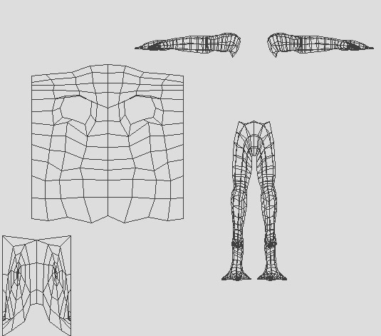 There still needs to be work done after this operation as some of the faces may overlap each other. Correct this, and even fit the pieces back together if you can determine where they go. The other option for the legs is to carefully select the faces and assign a planar map to them on the appropriate axis by hand. The feet were mapped with planar maps on the Y axis. If the geometry doesn?t map correctly, you can always select it differently and reapply the map.