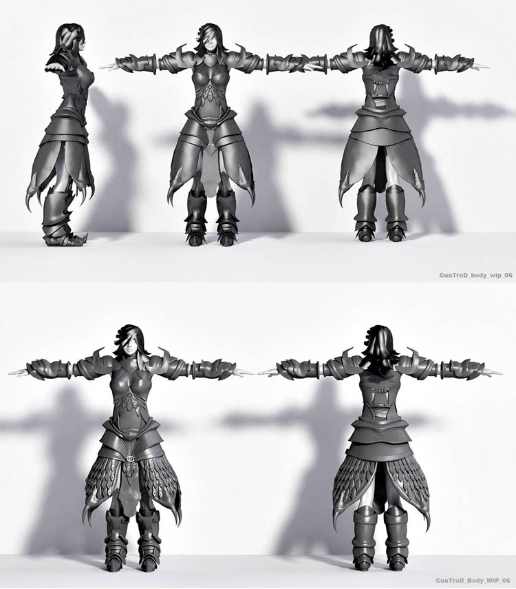The subject of character animation wasn’t something really within my plans, as its something I haven’t decided yet to learn, therefore the model hasn’t be prepared for such process, as there are for example there are some triangles in the grid. I hope to start my next project with this in mind and make a setup for positioning and perhaps animation. Once the body was finished, I started to model the armor pieces that would cover it, following the reference of some sketches I made, and in some parts just improvising and doing unexpected changes. As I made this in my free time between professional work, I had the time to think and made the adequate changes as I learned. All the pieces and parts of the armor were modelled using the box modelling technique, starting with a plane and a basic shape, this way there wouldn’t be hidden faces and there would less polygons and I would always reccur to the Shell as a solution.