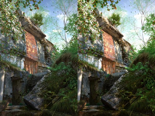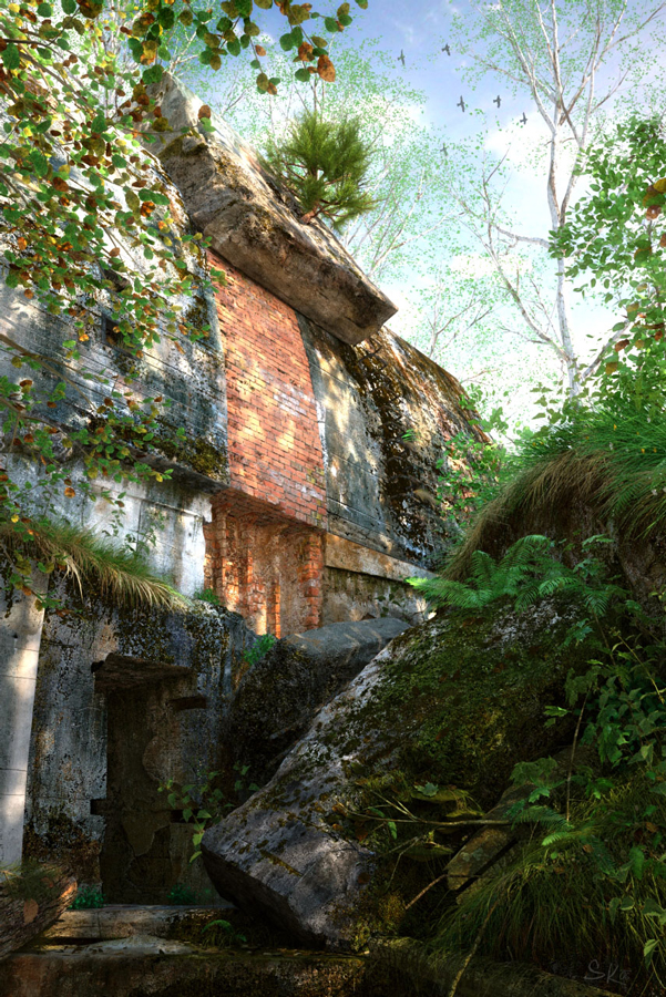 Rendering was difficult, I divided scene into four parts, left, right, conversion from main scene and trees because I didn´t used alpha map and last part was bacground. I devided scene because of 5,2 milions triangles and 3500×3500 textures, this couldn´t 3ds max handle with Maxwell, but with default scanline render was everything ok, so here is something wrong between 3ds max and Maxwell, I hope that it will be fixed soon. I must decided which objects could I delete because every bigger objects could changed light conditions in Maxwell.Every part was rendered on Athlon X2 4400+ with 2GB Ram for four nights (but the most of scene was done on Athlon 2500+ with 512MB Ram really torture), and every close up renders were rendered for two nights, so final rendertime was about three weeks.