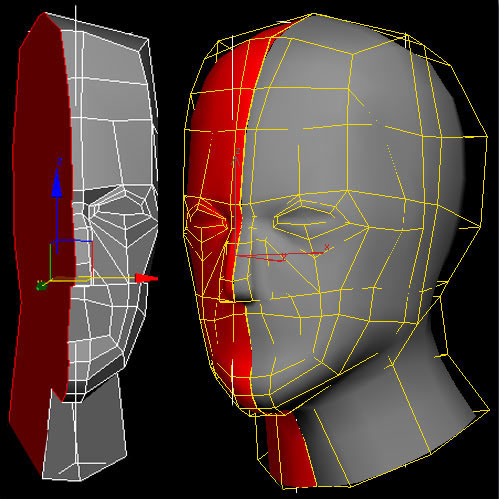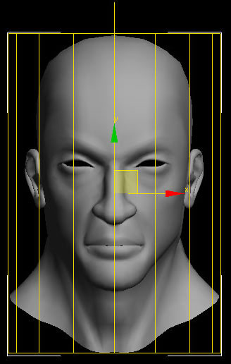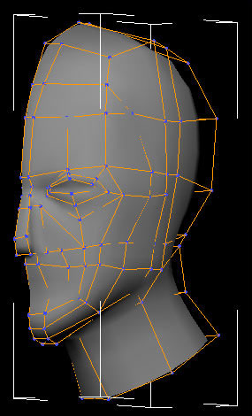 I converted the geometry into editable poly and using extrude poly, added segments to it (only half face to start off with). To get the basic shape of the character I moved the required vertices to match my drawing in the left and front viewport and simultaneously checked the model in the user viewport.