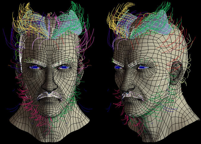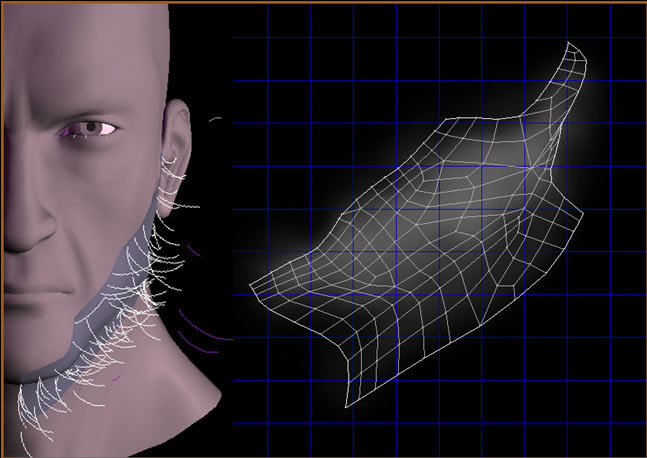 I will explain you the beard portion. In photoshop, I then painted dark and the bright areas under the reference of the beard wireframe. I applied this map with a material ID to the beard element.