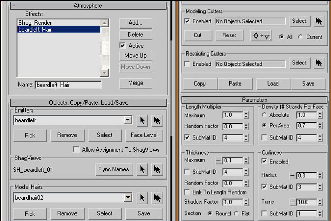 Choose Rendering > Environment, add shaghair and also shagrender . Now choose shaghair and name it as beardleft hair. In the object, copy/paste, load/save