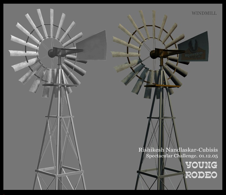 Then I concentrated in making the background models such as the kids father, clouds, fence and the wind-mill which I rendered separately to do compositing later.