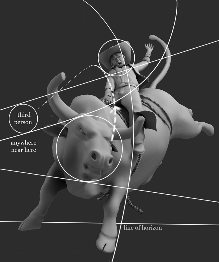 At the last moment I decided to change the camera angle for the action pose of the cowboy and the bull which previously didn’t gave the spectacular and dynamic view. I also did a study of the line of action and line of forces to get the composition right.